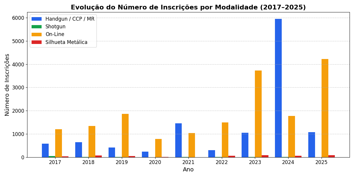 Entre 2017 e 2025, observa-se um crescimento expressivo no número de inscrições em diversas modalidades, com destaque para o Handgun/CCP/MR e o Campeonato On-Line, que se tornaram pilares da prática esportiva. Mesmo durante os anos de pandemia, quando a maior parte das competições presenciais foi suspensa, a modalidade On-Line manteve o esporte vivo e garantiu a continuidade da interação entre os atletas.